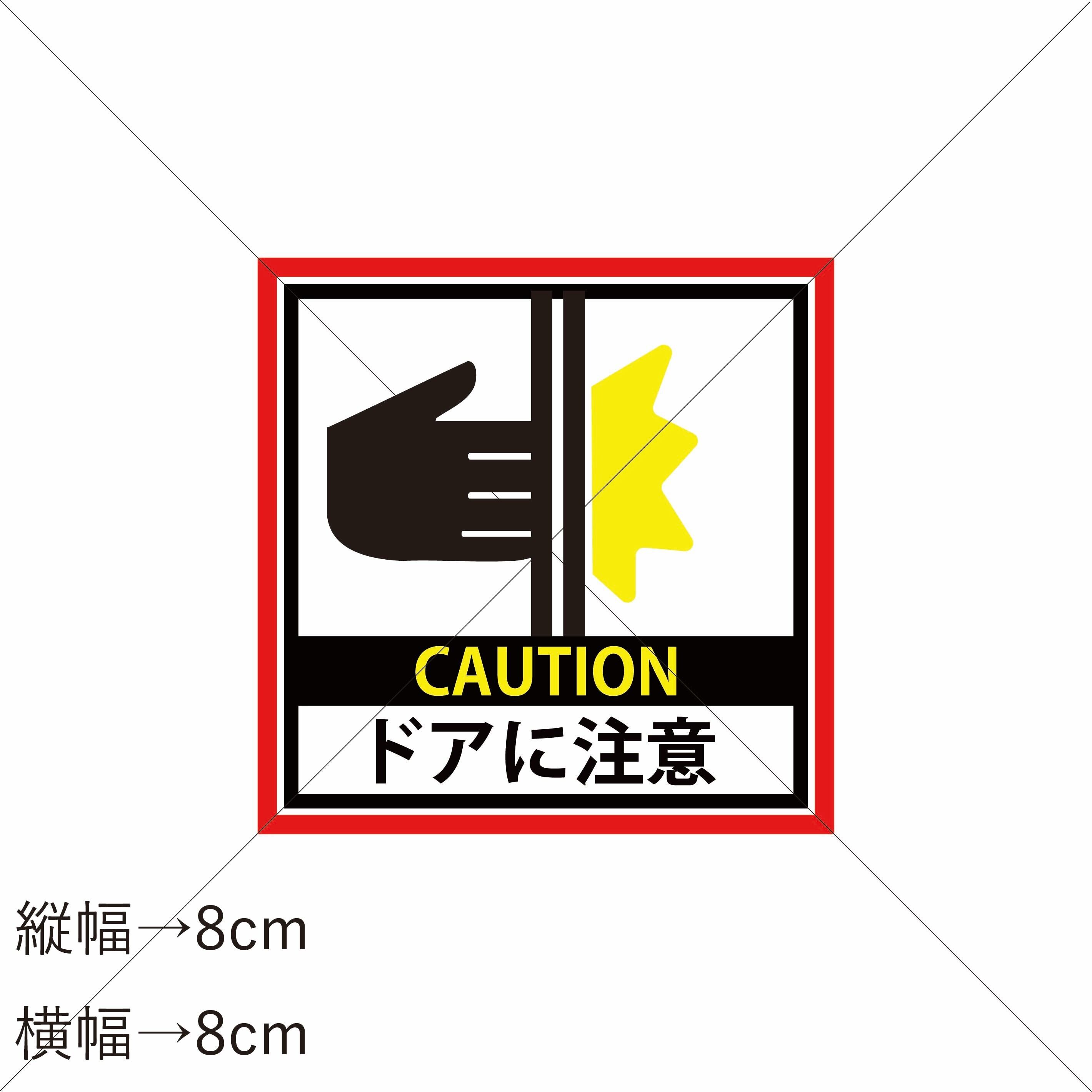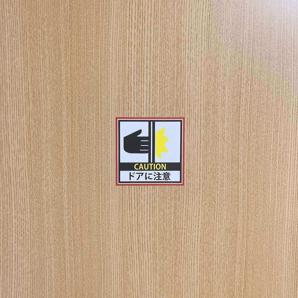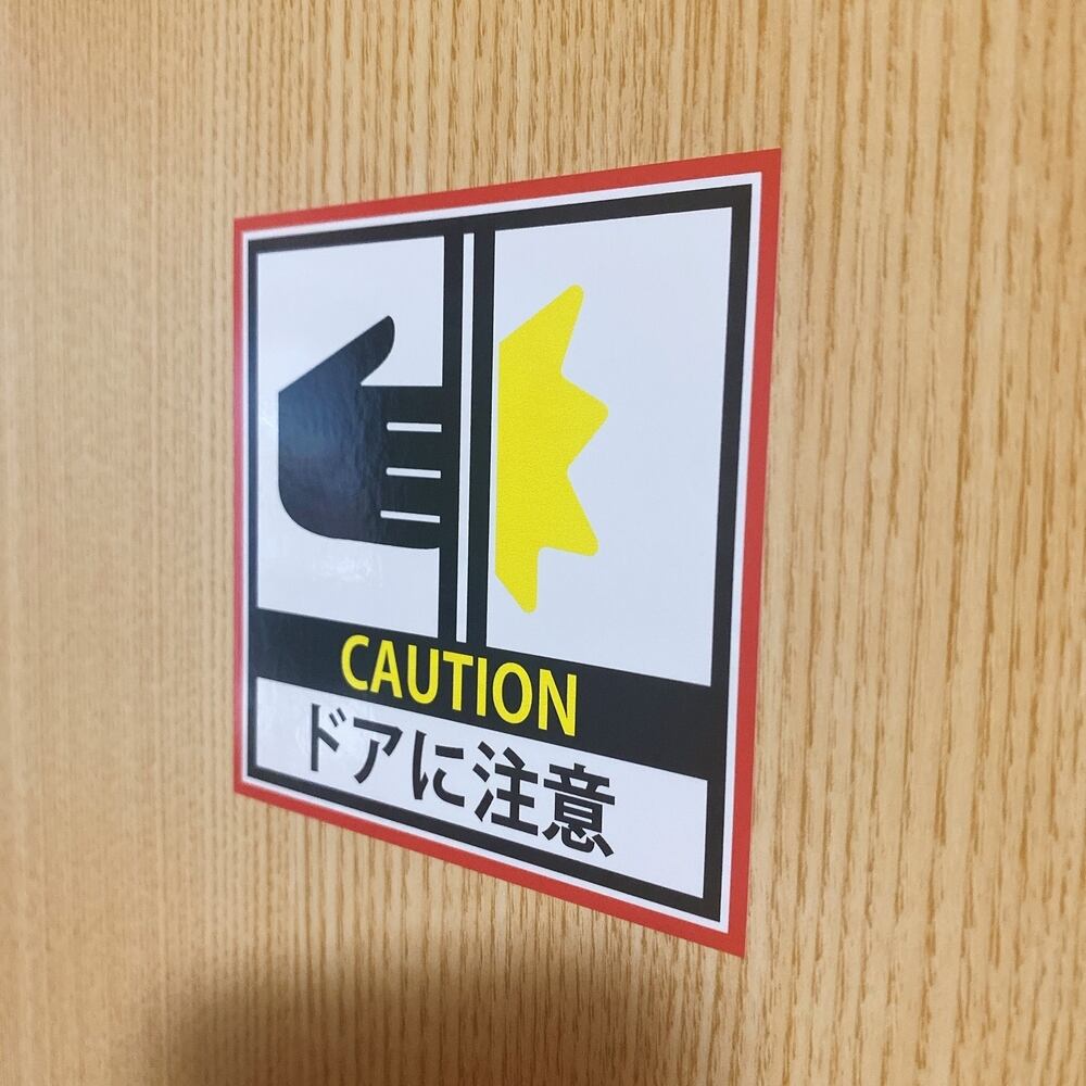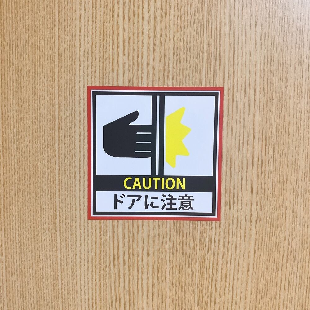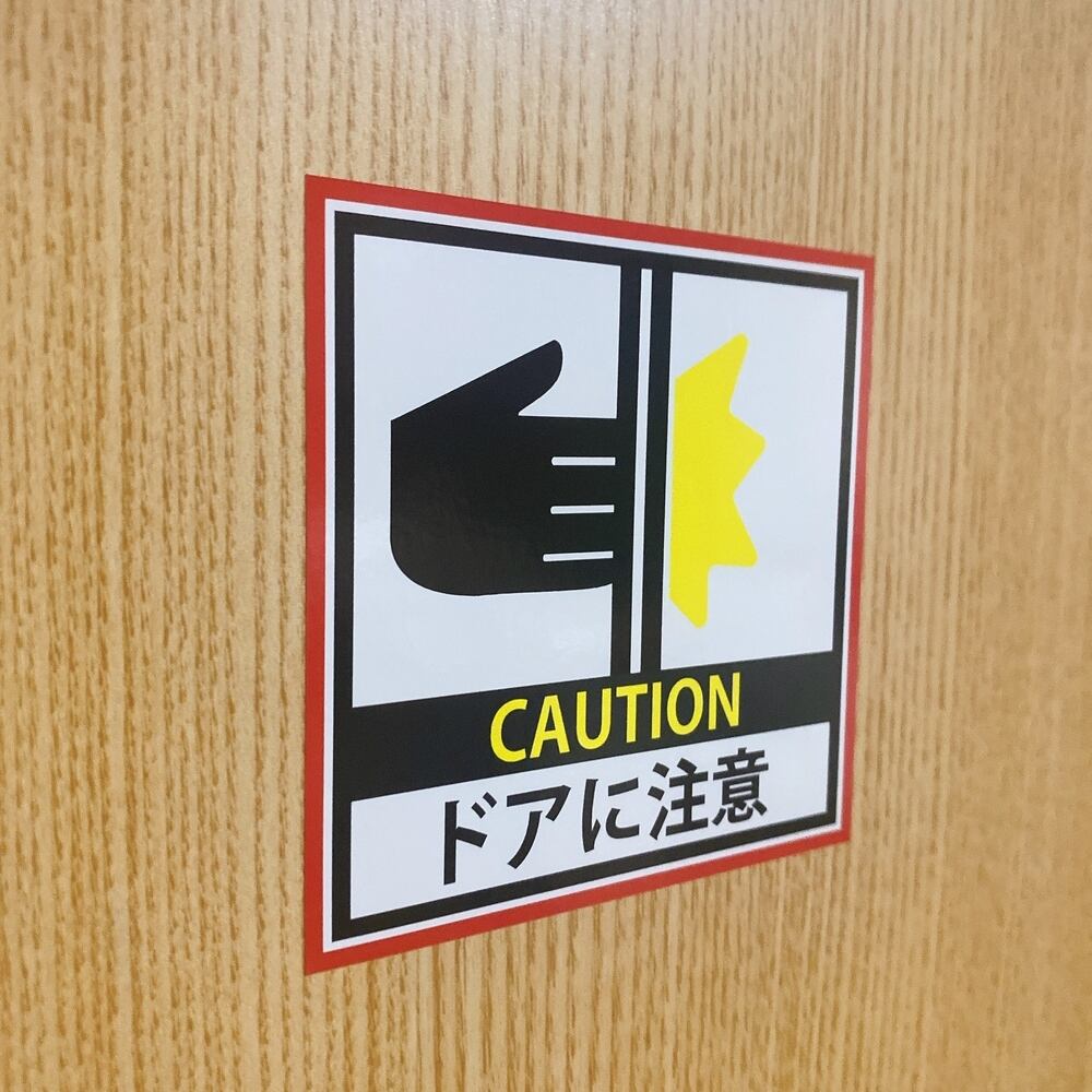 このシールは、挟まれやすいドア周辺に設置することで、利用者に対して注意を促します。